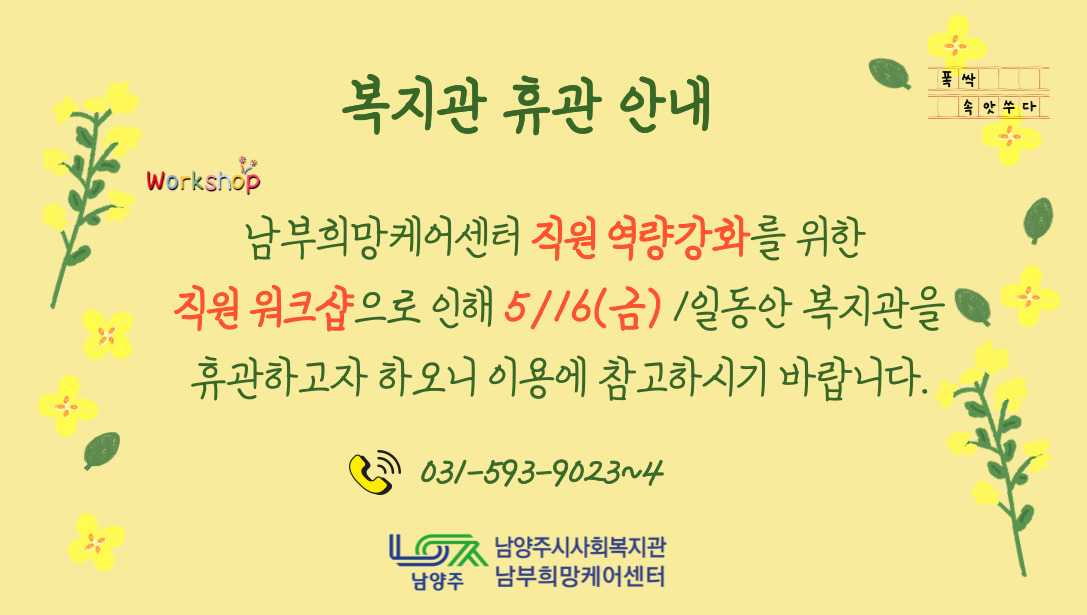 남부희망케어센터 [남부희망케어센터] 직원 워크샵으로 인한 휴관 안내 등록일자 2025-05-15 조회 146 내용 안녕하세요!남양주시사회복지관 남부희망케어센터입니다.복지관 직원 워크샵으로 인해 아래와 같이 휴관하오니이용에 참고하시기 바랍니다. *휴관일자 : 2025년 5월 16일(금) *사 유 : 전 직원 워크샵 참석(역량강화) *문 의 : 031-593-9023이용에 불편을 드려 죄송하며, 더 나은 서비스 제공을위한 시간이오니 너른 양해 부탁드립니다.감사합니다. 첨부파일 워크샵 휴관안내.jpg [ Size : 136.42KB, Down : 70 ] 미리보기 다운로드 목록보기