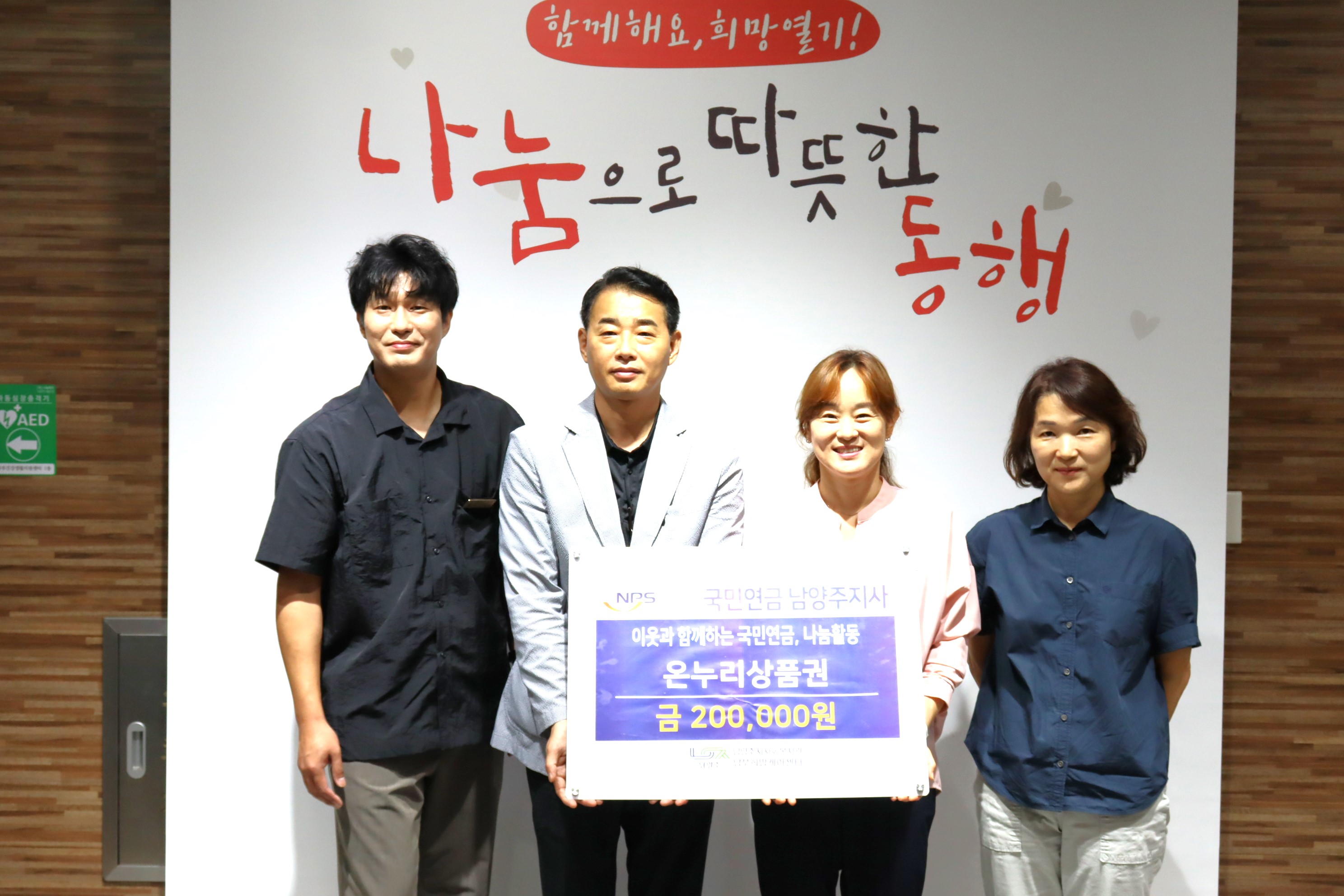 국민연금 남양주지사는 남양주시사회복지관 남부희망케어센터에 소외계층을 위해 20만원 상당의 온누리상품권을 기탁했다.