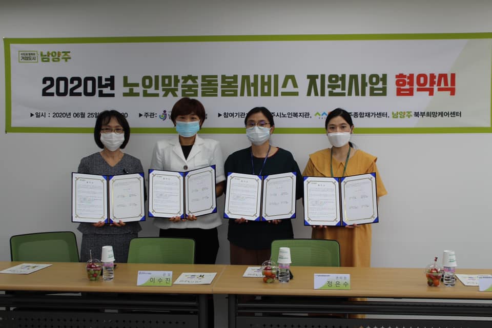 북부희망케어센터는 노인맞춤돌봄 지원사업 협약식을 진행하였다. 북부희망케어센터와 함께 노인맞춤돌봄사업을 수행하고 있는 기관인 남양주시노인복지관(관장 각진), 남양주종합재가센터(센터장 정은수)와 남양주시니어클럽(관장 이수진)이 지역사회 내 노인맞춤돌봄 체계를 구축하고, 노인맞춤돌봄 사각지대가 없는 남양주를 만들기 위해 협약식을 진행하였다. 이 자리를 통해 지역사회 자원연계, 서비스 조정, 통합을 위한 연계 시스템을 구축하여 노인맞춤돌봄서비스 수행을 원활히 하고자 하는데 목적을 두는 자리가 되었다. * 노인맞춤돌봄서비스란? : 노인맞춤돌봄서비스는 65세 이상 독거어르신들을 대상으로 생활지원사 방문 및 유선을 통해 안전안부확인을 제공하고 가사지원과 이동지원, 사회의 다양한 자원을 연계하는 등 독거어르신들의 손과 발이 되어주는 서비스