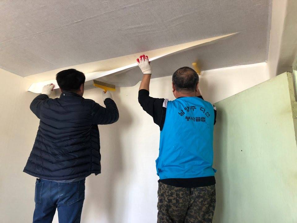 작년 4월, 김성웅(63세/남/가명)씨는 인근 산에서 노숙 생활을 하다가 지역사회의 도움으로 고시원에 가게 되었고, LH전세임대주택을 통해 현재 살고 있는 아파트로 이사올 수 있었다. 하지만 오래되고 낡은 아파트라 천장에 물이 새 곰팡이가 곳곳에 생겨 위생상 좋지 않고 냄새가 나 생활하는데 매우 불편함을 느끼고 계셨다. 오남다산봉사클럽(회장 김광호)은 곰팡이를 깨끗이 닦아내고 새로운 벽지로 교체해주었으며 오래된 전등도 교체하여 어두웠던 방을 환하게 밝혀주었다. 김성웅(가명)씨는 "깨끗하고 환한 방이 생겨 너무 감사하고 좋다."고 말씀하셨다. 다산봉사클럽은 매월 1회 집수리 봉사를 진행하고 있다.