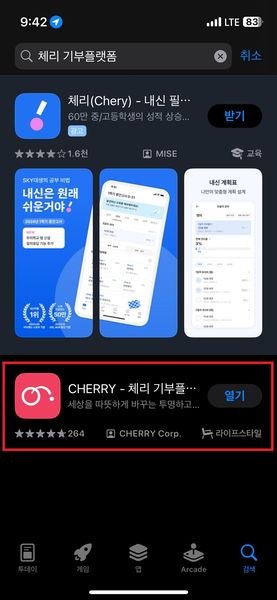 1. 앱스토어, 플레이 스토어 '체리 기부플랫폼' 검색 후 설치