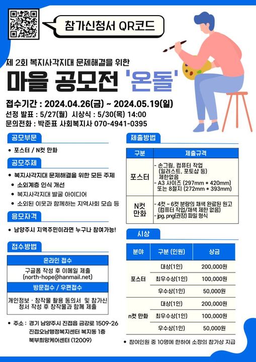 저희 북부희망케어센터(센터장 전정수)에서 제 2회 마을 공모전 '온돌'을 진행합니다!! 복지사각지대 문제해결을 주제로 진행되는 이번 공모전은 포스터 / N컷만화 두 부문으로 나누어 진행되어 지역주민들의 다양하고 창의적인 아이디어를 모집하고, 보내주신 작품들을 활용해 전시회도 진행 할 예정이니 많은 관심과 참여 부탁드립니다!!