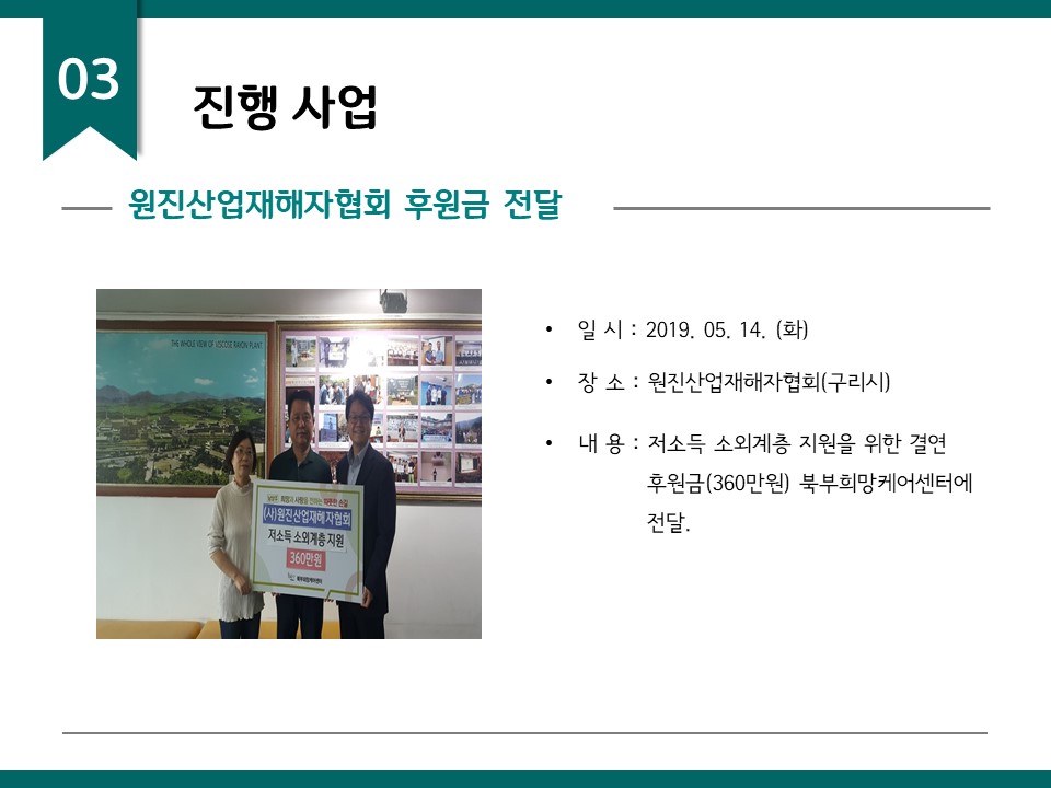 북부희망케어센터는 지난 2019년 5월 지역사회와 다양한 사업을 진행하였습니다. 항상 북부희망케어센터와 지역사회를 위해 나눔을 해주시는 모든 분께 감사드립니다. 자세한 내용은 이미지를 참고해주세요.