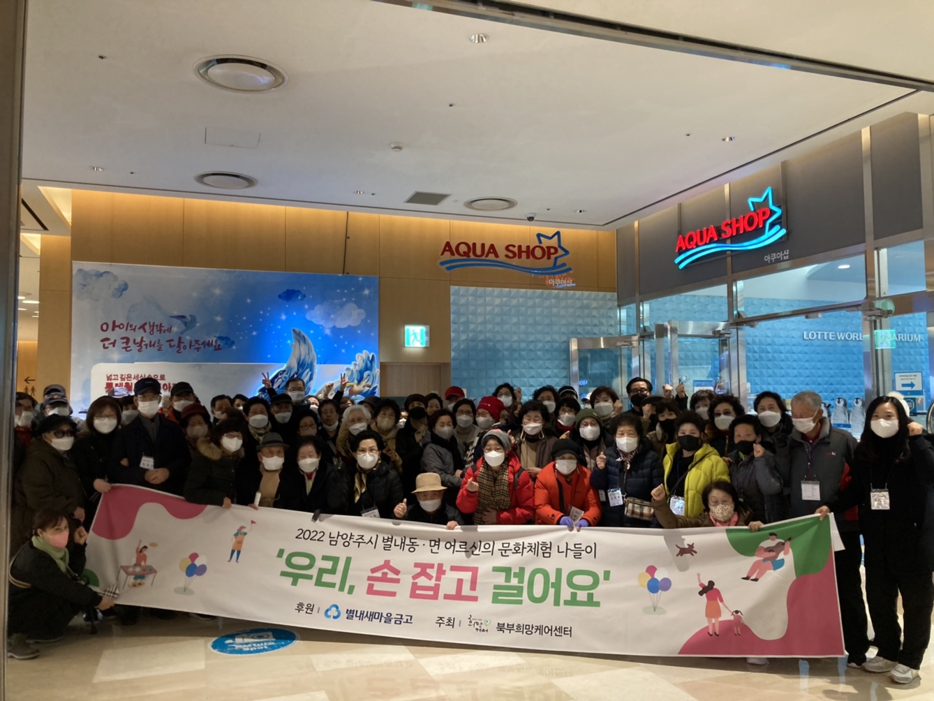안녕하세요 남양주시사회복지관 북부희망케어센터(센터장 전정수)에서는 지난 11월 30일에 MG별내새마을금고 이사장 남경우 및 전무 남은미 외 직원 30명의 지원으로 별내면·동 어르신 50분을 모시고 롯데월드 아쿠아리움으로 나들이를 다녀왔는데요! 아쿠아리움 내에서 열대의 강, 아마존 강, 극지방 등 다양한 해양생태계에서 서식하는 생물들을 관람하고, 먹이주기 등 다양한 경험과 체험활동을 하는 시간을 가졌습니다. 그리고 롯데월드몰 내에 있는 브럭시에서 디저트를 드시며 휴식을 즐기고 일정이 끝난 후에는 별내동의 갈비예찬에서 버섯생불고기 전골을 식사하며 이웃들과 소통하며 담소를 나누는 시간을 가졌습니다. 특히 이번 나들이는 MG별내여성대학봉사단 25명이 참여하여 몸이 불편하신 어르신의 손과 발이 되어 더욱 안전하게 나들이를 다녀올 수 있었습니다. 이번 나들이를 지원해주신 MG별내새마을금고 직원분들과 MG여성대학봉사단분들에게 깊은 감사인사를 드립니다!