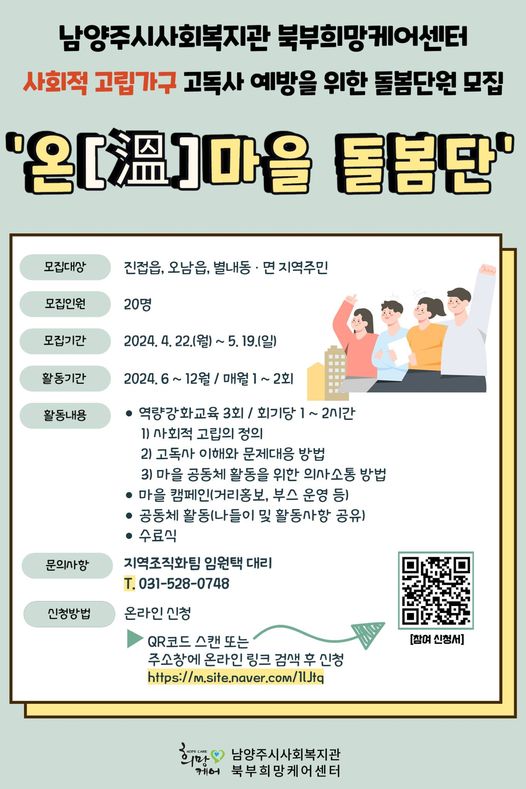 안녕하세요! 북부희망케어센터(센터장 전정수)는 지역사회 내 돌봄 네트워크를 구축하고자 지역주민에게 주민교육과 공동체 활동을 연계하여 복지 사각지대 발굴 및 위기상황 예방을 위한 온[溫]마을 돌봄 단원을 모집하오니 많은 관심 부탁드립니다.