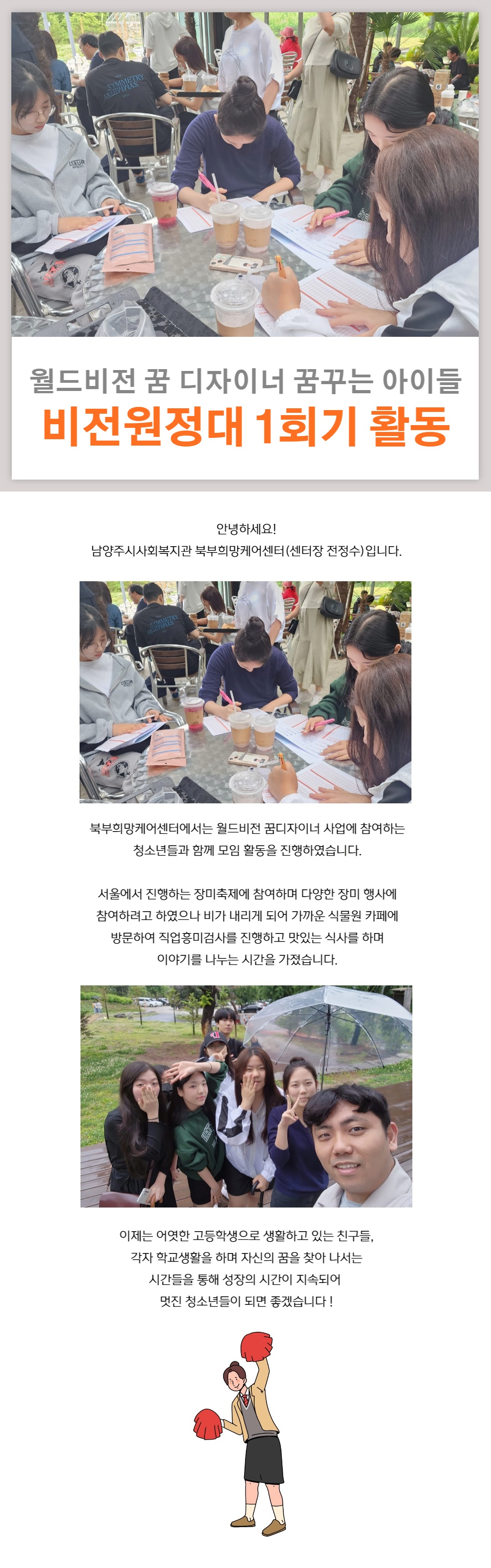 북부희망케어센터 북부희망케어센터 / 월드비전 꿈 디자이너 꿈꾸는 아이들 비전원정대 1회기 활동 등록일자 2023-06-13 조회 202 내용 . 첨부파일 월드비전 꿈 디자이너 꿈꾸는 아이들 비전원정대 1회기 활동.jpg [ Size : 816.15KB, Down : 81 ] 미리보기 다운로드 목록보기