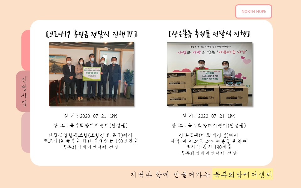 북부희망케어센터는 지난 2020년 7월 지역사회와 다양한 사업을 진행하였습니다. 항상 북부희망케어센터와 지역사회를 위해 나눔을 해주시는 모든 분께 감사드립니다. 자세한 내용은 이미지를 참고해주세요.