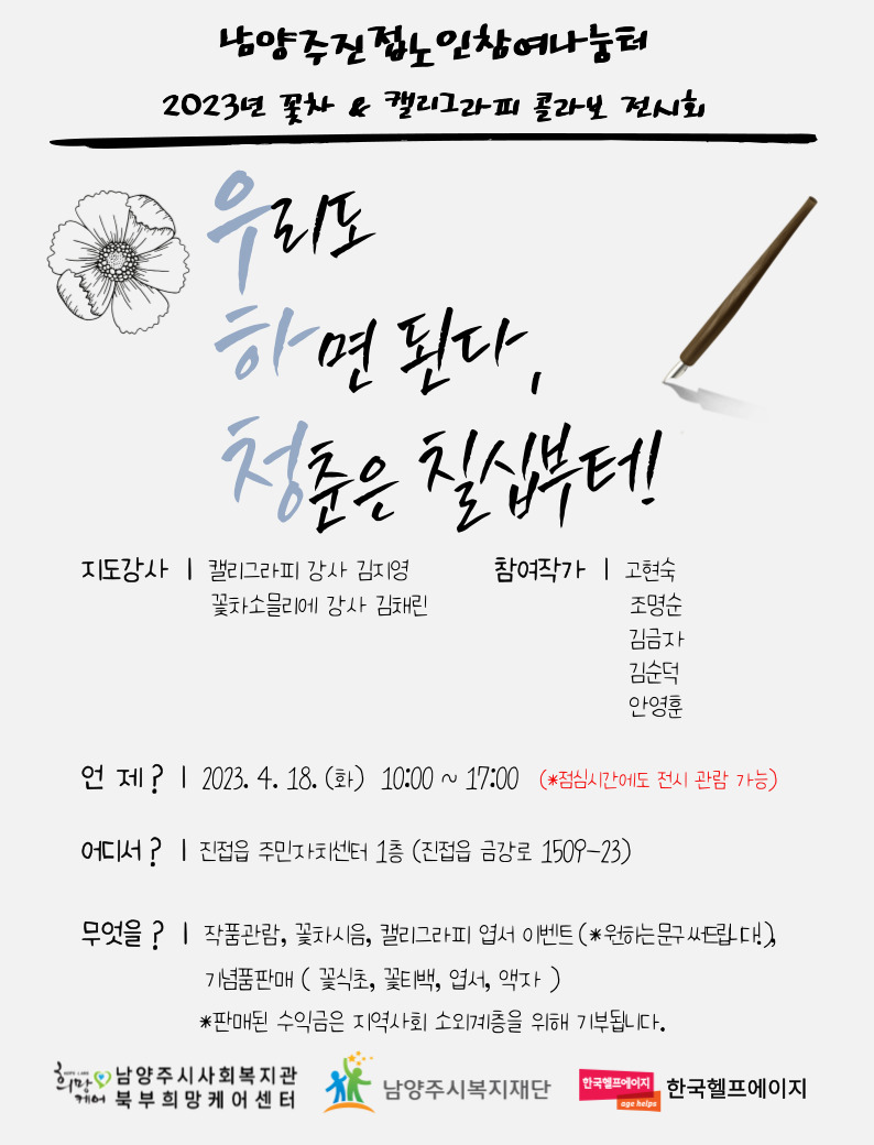 안녕하세요! 북부희망케어센터(센터장 전정수)에서는4월 18일(화)에 진행되는 남양주진접노인참여나눔터 시니어 전시회를 소개하고자 합니다. 이번 전시회는 "우리도 하면된다, 청춘은 칠십부터!" 라는 어르신들의 희망찬 포부를 담은 주제의 전시회로 진접에 거주하고 있는 저소득 어르신들이 나눔터 활동을 하며 탄생한 캘리그라피, 꽃차소믈리에 참여작품을 직접 전시하고자 합니다. 작품관람 외에도 꽃차시음, 캘리그라피 엽서 이벤트(원하는 문구 써드립니다!), 기념품 판매(꽃식초, 꽃티백, 엽서, 액자) 등이 준비 되어있고, 판매된 수익금은 어르신들의 이름으로 지역사회 소외계층을 위해 기부할 계획입니다. 저소득 어르신들이 지역사회에 사회구성원으로 참여와 나눔활동을 실천하고자 합니다. 이번 전시회를 시작으로 주체적 참여자로서의 한 발을 내딛는 소중한 순간에 귀한 발걸음 해주셔서 함께 응원해주시길 바랍니다 !