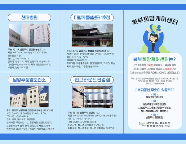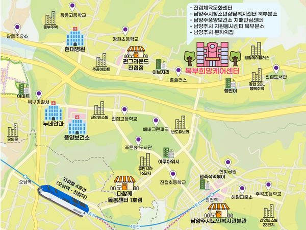 북부희망케어센터 남양주시사회복지관 북부희망케어센터 진접 마을지도 등록일자 2024-07-25 조회 213 내용 안녕하세요!오늘은 사회복지현장실습생 선생님들께서 센터가 위치한 진접 지역 주변의 마을지도를 제작해 보았습니다. 이 지도에는 오실 때 참고하실 수 있도록 진접에 위치한 의료시설, 복지시설, 학교, 도서관, 공원뿐만 아니라 후원해주시는 협력업체도 표기하였으니 도움이 되셨으면 좋겠습니다.이웃을 위해 항상 나눔을 실천해주시는 후원자분들, 자원봉사자분들과 관심을 가져주시는 주민분들께 모두 감사드립니다. 첨부파일 1.jpg [ Size : 60.78KB, Down : 146 ] 미리보기 다운로드 2.jpg [ Size : 55.89KB, Down : 122 ] 미리보기 다운로드 목록보기