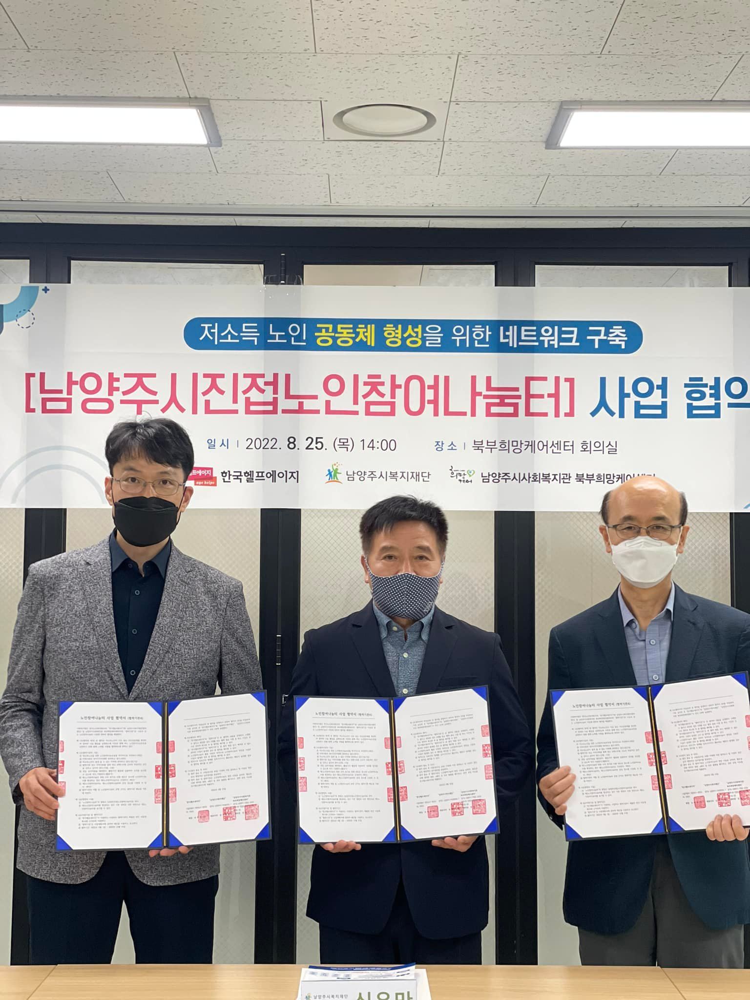 안녕하세요 남양주시사회복지관 북부희망케어센터(센터장 전정수)입니다. 2022년 8월 25일 목요일 북부희망케어센터에서는 '남양주시복지재단(대표이사 심우만)'과 '한국헬프에이지(회장 조현세)'와 "남양주시진접노인참여나눔터사업" 협약을 체결하였습니다. 남양주시진접노인참여나눔터 사업은 노인이 노인을, 서로가 서로를 돕는 자조공동체를 형성하여 나눔활동을 실천할 수 있도록 지원하는 사업인데요! 남양주시에서는 첫 번째로 추진하게되는 사업으로, 지역주민들의 많은 관심 부탁드립니다.