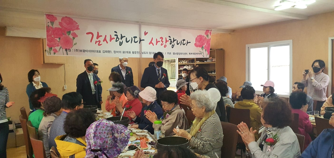 안녕하세요 오늘 5월 4일 남양주시사회복지관 북부희망케어센터(센터장 전정수)는 5월 가정의 달을 맞아, 별내동 60여분의 어르신들과 어버이날 행사를 진행했습니다. 이번 행사는 남도의향(대표 송양우), 장어의 꿈(대표 황문찬), 보광타이어(대표 김태환)의 후원으로 추진되었는데요! 별내행정복지센터 찾아가는보건복지팀, 북부희망케어센터, 별내동 제21 화생방대대, 자원봉사자분 등 많은 분들이 어르신들의 어버이날을 축하하기 위해 자리해주셨습니다. 어르신 한 분 한 분 카네이션을 달아드리고 어버이날의 의미를 되새기며 감사 인사와 함께 식사 자리를 가졌습니다. 5월 가정의 달 따뜻한 행사를 진행할 수 있도록 후원해 주신 남도의향, 장어의꿈, 보광타이어에 감사드리며, 어르신들을 위해 도움을 주신 별내행정복지센터 찾아가는 보건복지팀, 별내동 제21 화생방대대, 자원봉사자 분들 모두에게 감사드립니다.