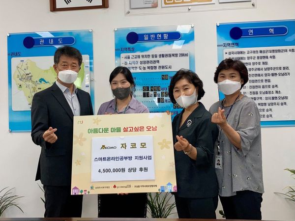 오늘 북부희망케어센터에는 밥을 안먹어도 배부른 나눔 소식이 있었습니다. 바로바로 ㈜자코모의 나눔인데요, 코로나19로 인해 가정에서 공부하는 학생들이 증가한 만큼 가정 내 학습환경이 중요해진 요즘입니다! 작년부터 올해까지 스마트꾸러미드림 사업으로 스마트기기를 지원받은 학생들에게 스마트공부방을 조성해주는 ????스마트온라인공부방 사업??이 진행되고 있는데요~ ㈜자코모(대표 박경분)에서는 이러한 소식을 듣고 선뜻 450만원 상당의 독서실책상세트를 8대 기부해주셨습니다! 전달식과 함께 ㈜자코모 박경분 대표님께서는 오남읍의 성장을 지켜봐 온 기업으로써 앞으로도 오남읍 지역주민을 위해 도움이 되는 봉사를 하고 싶다는 좋은 이야기를 해주셨습니다. 코로나19로 모두 지치고 힘든 시기에 따뜻한 나눔의 손길 감사드립니다.