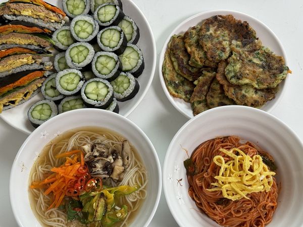 오늘의 메뉴는 잔치국수(비빔국수)/접어먹는김밥(오이김밥)/방아전을 준비해주셨습니다.
