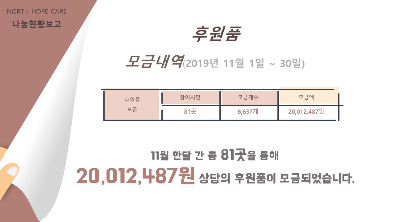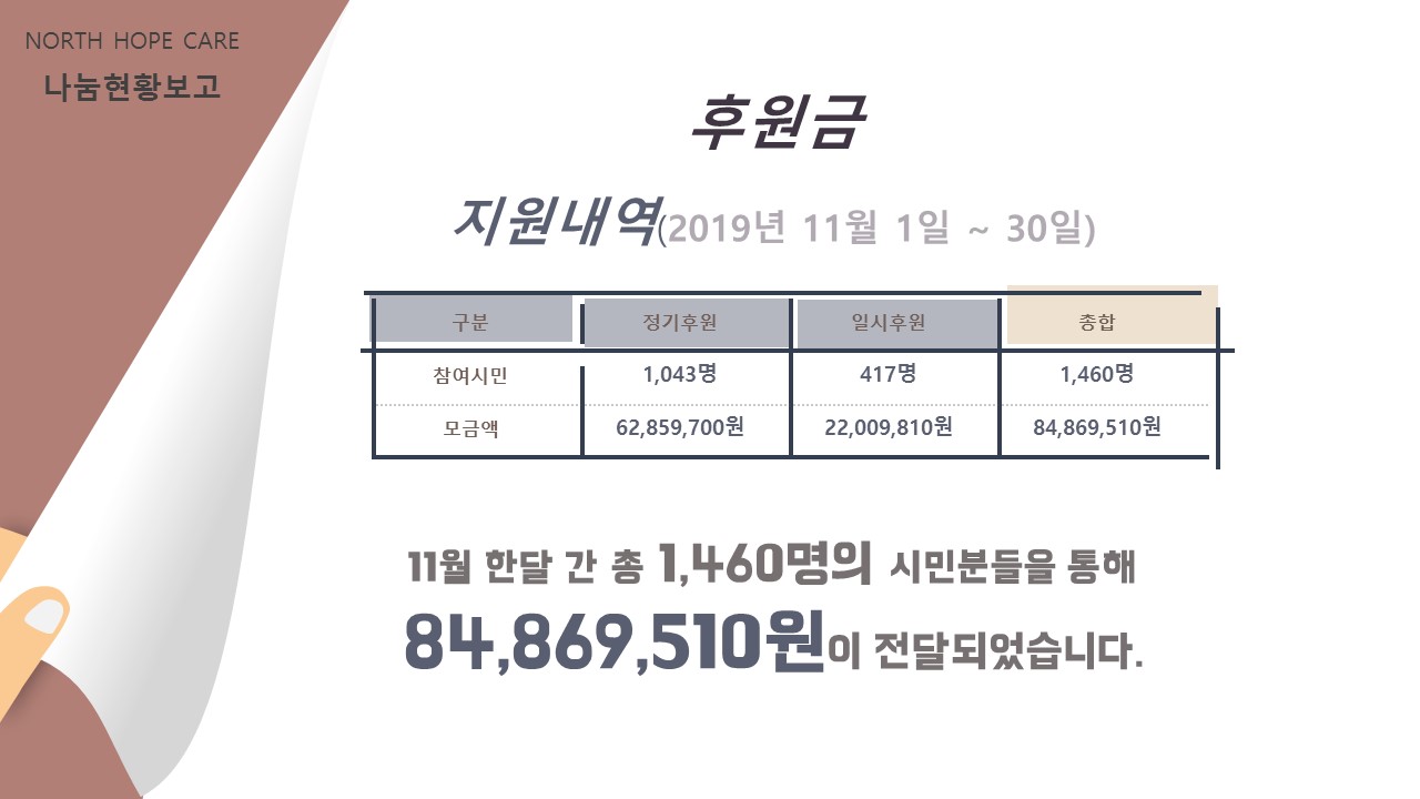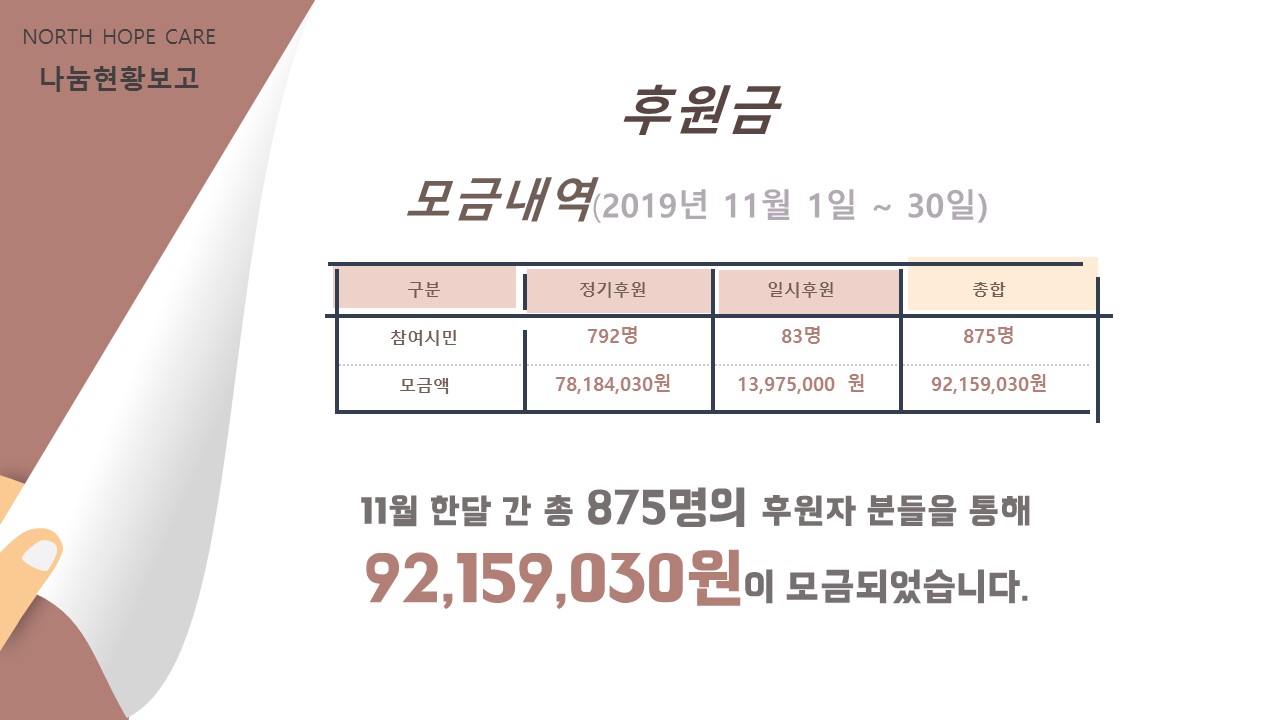 지난 11월 지역주민들이 함께 나누어주셨던 따뜻한 나눔현황을 보여드리고자합니다. 11월 한달 간 875명의 시민분들이 92,159,030원의 후원금을, 81곳의 시민분들이 20,012,487원 상당의 후원품을 나누어주셨습니다. 항상 북부희망케어센터와 지역사회를 위해 나눔을 해주시는 모든 분께 감사드립니다. 자세한 내용은 이미지를 참고해주세요.