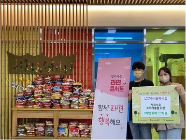안녕하세요! 남양주시사회복지관 북부희망케어센터(센터장 전정수)입니다. 지난 6월 30일 목요일 따뜻한 소식이 있어, 전달해드립니다! 남양주시 진접읍에 위치한 남양주시 문화의집에서는 ‘함께라면 행복해요’라는 주제로 관객과 함께 따뜻한 나눔 콘서트를 열었다고 합니다! '함께라면 행복해요'라는 콘서트는 지역 내 소외된 이웃들에게 따뜻한 나눔을 전달하고자, 입장료를 돈이 아닌 라면으로 받았다고 하는데요! 관객들도 콘서트와 함께 뜻깊은 나눔을 전할 수 있었기에 나눔에 의미가 더욱 컸습니다. 이번에 콘서트 입장료로 모아진 라면은 총 10Box로, 지역 내 소외계층 분들에게 전달되어질 예정입니다!