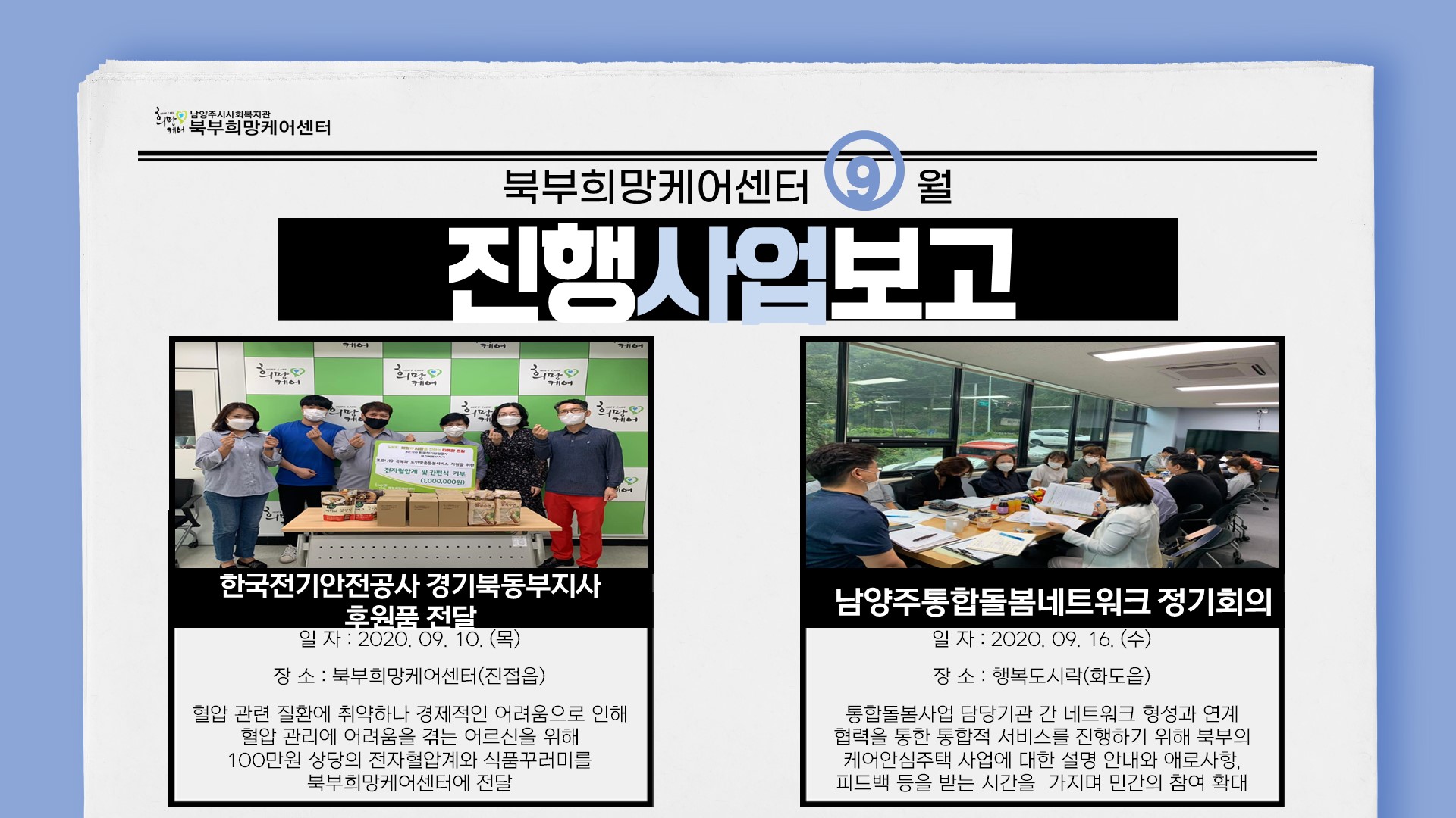 북부희망케어센터는 지난 2020년 9월 지역사회와 다양한 사업을 진행하였습니다. 항상 북부희망케어센터와 지역사회를 위해 나눔을 해주시는 모든 분께 감사드립니다. 자세한 내용은 이미지를 참고해주세요.
