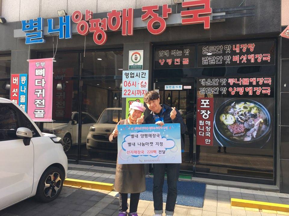 지난 21일 남양주시 별내동 소재 별내 양평해장국(대표 박영화)에서는 별내 저소득 소외계층을 위하여 선지해장국 연 220개(220인분)을 별내희망케어센터(센터장 류시혁)에 전달을 약속, 전달식을 진행하였다. 별내 양평해장국 박영화 대표는 “별내 지역의 소외계층을 위하여 나눔에 동참하고 싶다는 생각을 오래 가지고 있었는데 드디어 동참할 수 있게 되어 진심으로 기쁘다. 나눔마켓을 이용하는 이용자분들께서 따뜻한 마음을 전달받아 맛있게 드셨으면 좋겠다.”라고 밝혔다. 이 날 전달된 선지해장국은 별내 권역의 저소득 소외계층이 월 1회 이용하는 별내나눔마켓에 기탁, 나눔마켓 이용자에게 전달될 예정이다.