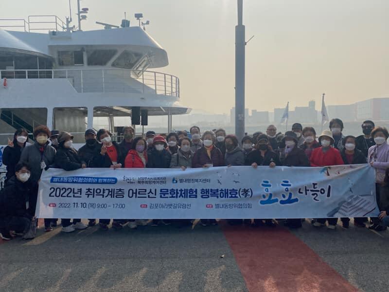 안녕하세요 남양주시사회복지관 북부희망케어센터(센터장 전정수)입니다. 지난 2022년 11월 10일 목요일 북부희망케어센터에서는 별내동 어르신을 모시고 김포에 있는 경인아라뱃길과 서울 식물원으로 나들이를 다녀왔는데요! 경인아라뱃길에서는 유람선을 탑승하여 선상 우크라이나 전통 공연 및 마술쇼를 관람하고 선상 런치뷔페를 이용하여 즐거운 식사를 했습니다. 식사 후에는 서울 식물원을 방문하여 관람했습니다. 나들이에 참여한 어르신은 "배도 타고 공연도 보니까 너무 재미있었다", "앞으로도 자주 불러주세요", "좋은 기억을 만들어 주셔서 감사합니다" 라고 소감을 전했습니다. 이날 나들이를 위해 지원해주신 별내동 방위협의회와 별내행정복지센터에 감사인사드립니다.