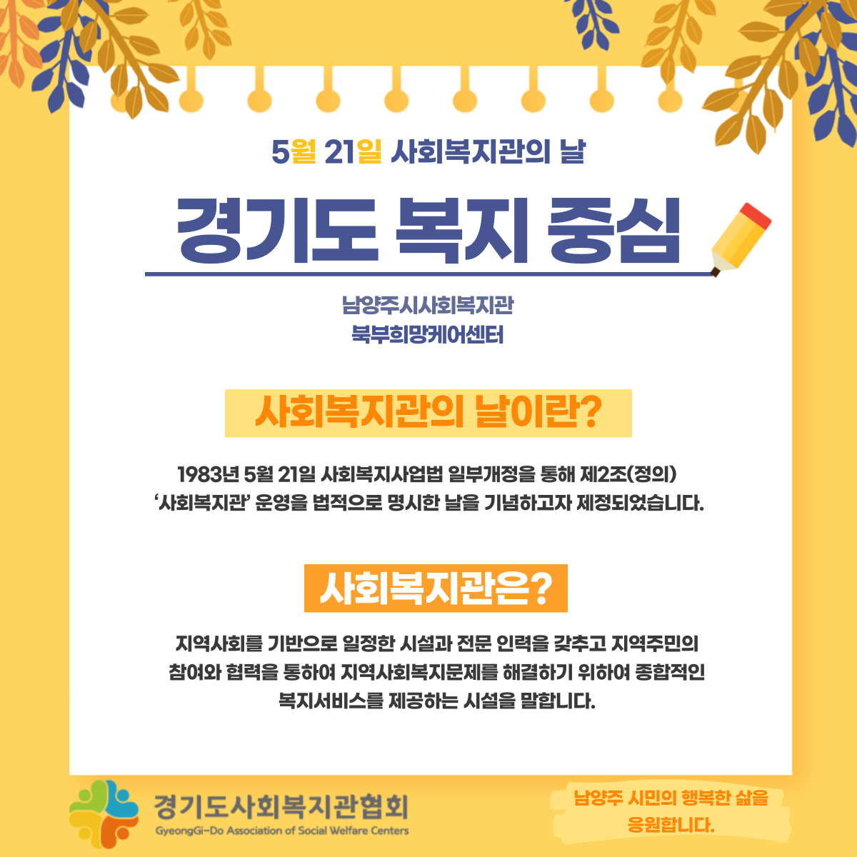 안녕하세요! 남양주시 사회복지관 북부희망케어센터(센터장 전정수)입니다. 다가오는 5월 21일은 바로 사회복지관의 날인데요! 5월 21일 사회복지관의 날은 1983년 5월 21일 사회복지사업법 일부개정을 통해 제2조(정의) ‘사회복지관’ 운영을 법적으로 명시한 날을 기념하고자 제정되었습니다. 사회복지관의 날을 맞이하여 많은 관심과 응원 부탁드립니다!