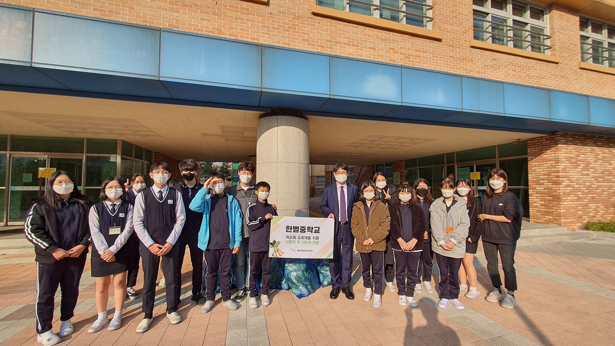 북부희망케어센터는 별내동 소재 한별중학교(교장 정금채)를 방문하여 후원품 전달식을 진행하였다. 한별중학교는 지난 2019년 아이들이 직접 재배한 야채를 전달해주었는데, 올 해도 학생들이 직접 재뱋나 무를 북부희망케어센터에 전달해주었다. 전달해주신 무는 관내 장애인복지시설에 전달되었다.