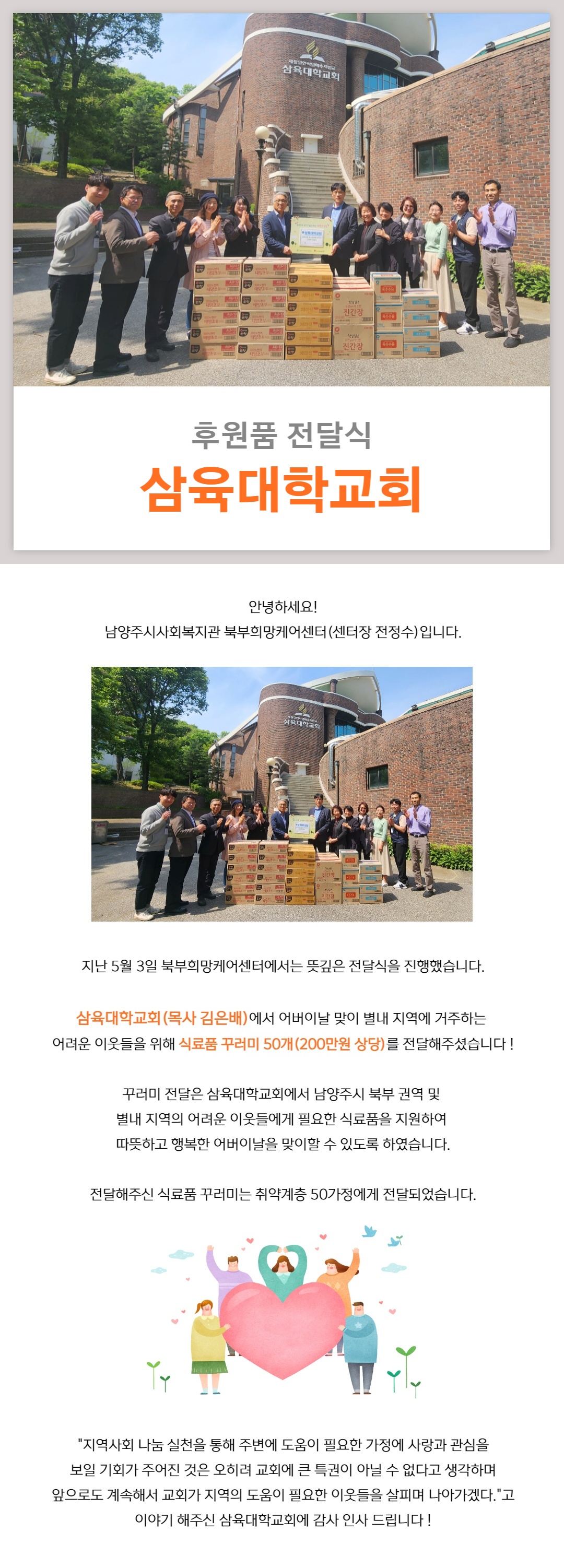 북부희망케어센터 북부희망케어센터 / 삼육대학교회 후원품 전달식 등록일자 2023-06-13 조회 192 내용 . 첨부파일 삼육대학교회 후원품 전달식.jpg [ Size : 840.84KB, Down : 77 ] 미리보기 다운로드 목록보기
