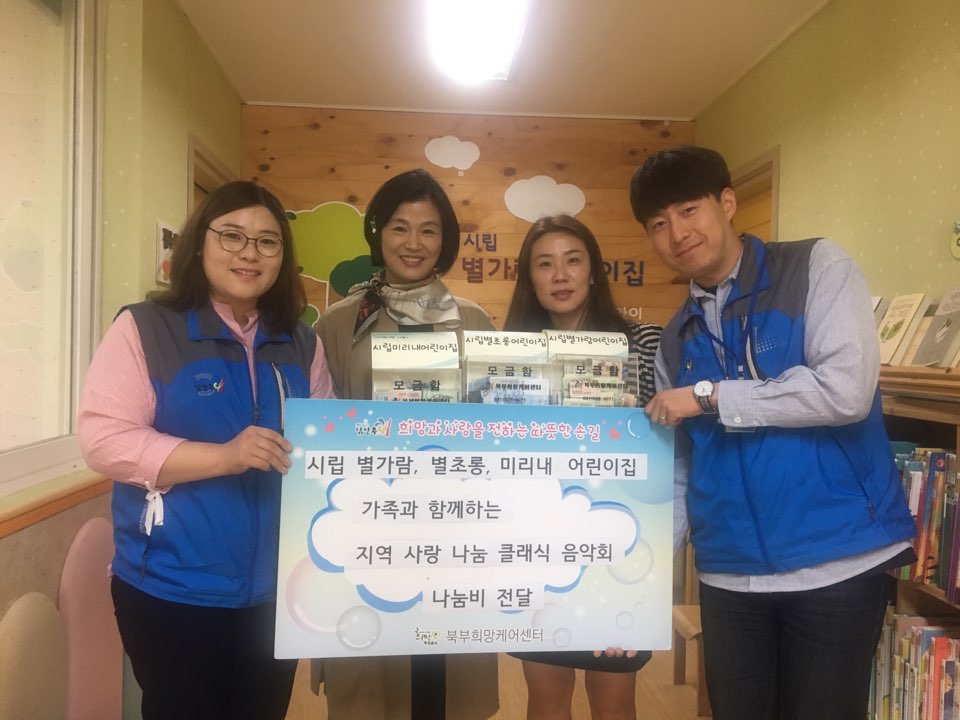 지난 09일(수) 별내동 소재 시립 별가람어린이집(원장 이진), 시립 별초롱어린이집(원장 이근희), 시립 미리내어린이집(원장 이현자)에서는 가족과 함께하는 지역사랑 나눔 클래식 음악회 나눔비 611,500원을 별내희망케어센터(센터장 류시혁) 전달하였다.