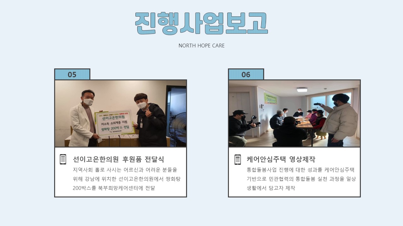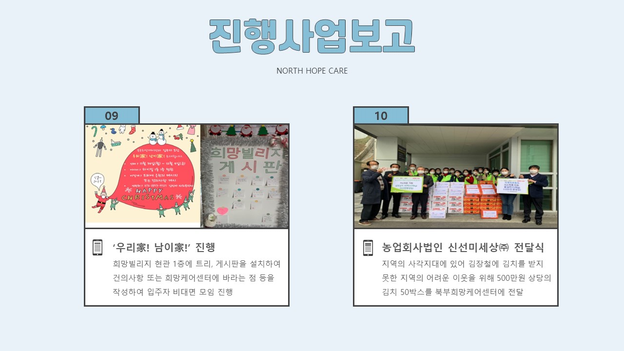 북부희망케어센터는 지난 2020년 12월 지역사회와 다양한 사업을 진행하였습니다. 항상 북부희망케어센터와 지역사회를 위해 나눔을 해주시는 모든 분께 감사드립니다. 자세한 내용은 이미지를 참고해주세요.