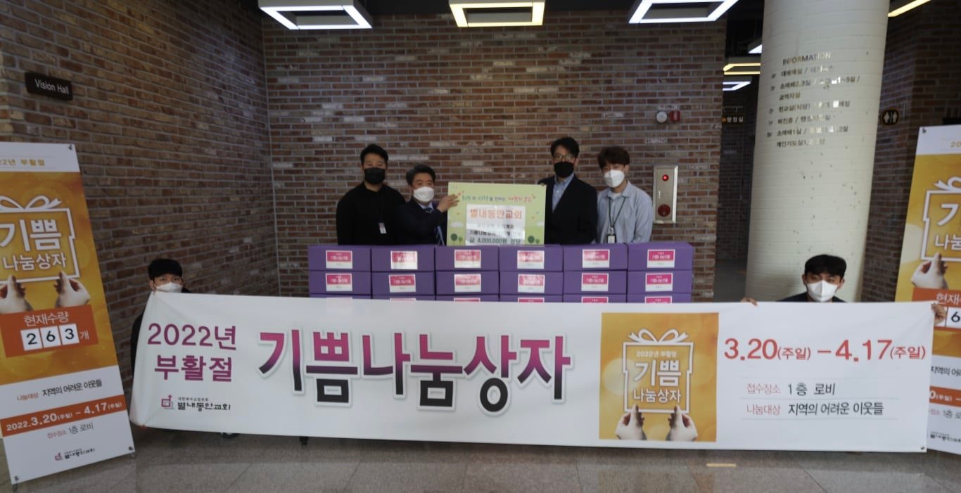 안녕하세요. 지난 4월 19일에 있었던 따뜻한 나눔의 소식을 전달해 드립니다! 남양주시 별내동에 위치한 별내동안교회는 부활절을 맞아 지역사회 소외계층을 위한 기쁨나눔 상자 193박스(460만 원 상당)를 북부희망케어센터에 전달해주셨는데요! 이날 전달해주신 ‘기쁨나눔상자’는 2만 4천 원 상당의 라면, 커피 등 먹거리 위주의 생필품으로 구성되었는데요, 교회 성도들이 직접 제작한 격려의 메시지를 적은 카드를 담아 부활의 기쁨과 나눔의 의미가 더해졌습니다! 이날 전달된 기쁨나눔상자는 북부권역(진접, 오남, 별내) 내 어려운 이웃 193가구에게 전달될 예정입니다! 매년 부활절을 맞이하여 이웃 사랑을 실천해주시는 별내동안교회에 감사드립니다!