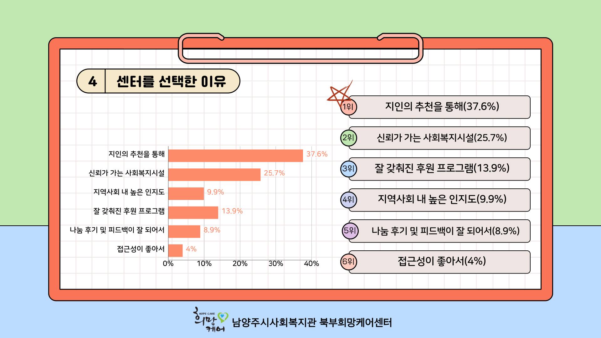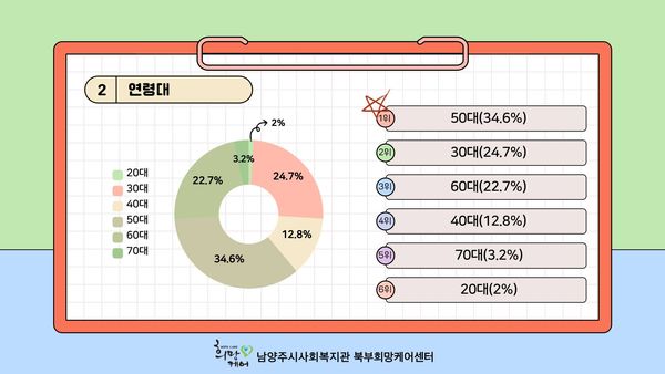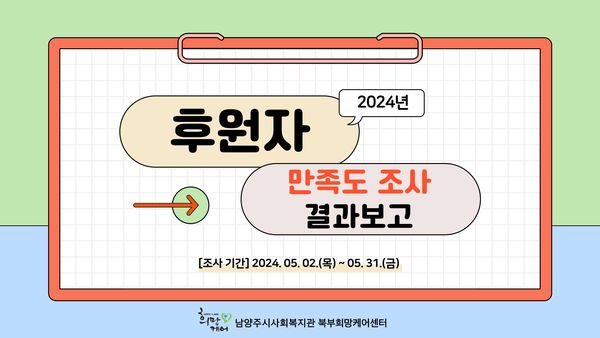 북부희망케어센터는 후원자님들을 대상으로 후원 서비스 및 프로그램 만족도 설문조사를 실시하여 의견을 수렴하고 서비스 개선과 활성화 방향을 모색하고자 5월 2일(화) ~ 31일(금) 한달 간 후원자 만족도 조사를 진행하였습니다!