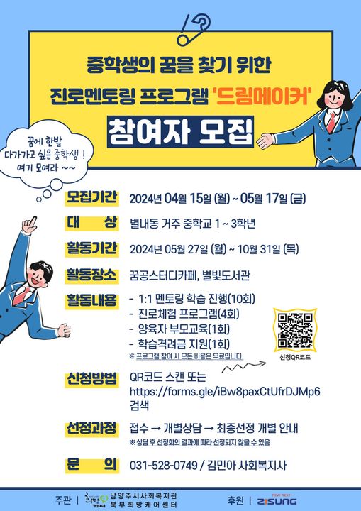 남양주시사회복지관 북부희망케어센터(센터장 전정수)는 '지성ECS' 후원으로 별내동 지역 내 진로에 대해 고민하고 있는 중학생을 대상으로 꿈을 찾기 위한 진로멘토링 프로그램 '드림메이커' 참여자를 모집하고 있습니다 !