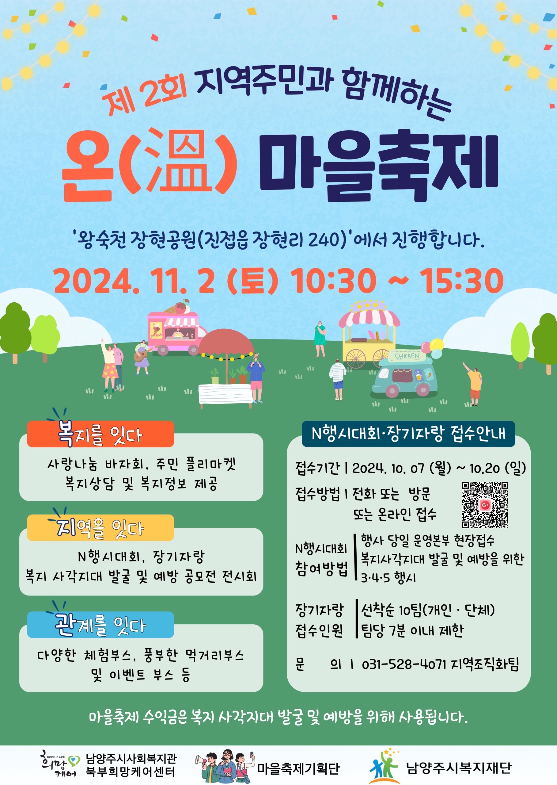 11월 2일(토) 10:30~15:30, 왕숙천 장현공원(진접읍 장현리 240)에서 제2회 지역주민과 함께하는 온(溫)마을축제를 진행합니다.
