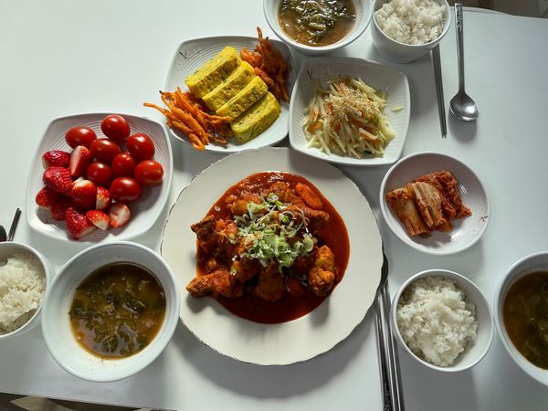 메뉴는 닭볶음탕, 배추된장국, 계란말이, 감자채볶음, 당근튀김, 배추김치, 방울토마토, 딸기였습니다!