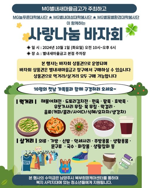 10월 1일 화요일 오전 10시부터 오후 6시까지 별내새마을금고 본점 주차장에서 사랑나눔바자회가 진행될 예정입니다!
