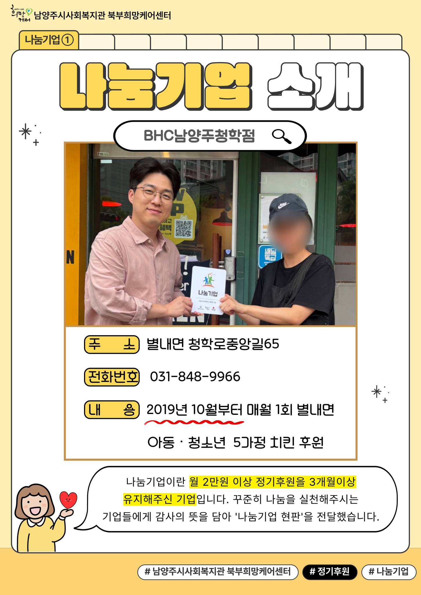 북부희망케어센터 [북부희망케어센터] 나눔기업 소개 ① 등록일자 2025-08-04 조회 117 내용 안녕하세요 북부희망케어센터(센터장 전정수)의 나눔기업을 소개해드리려고 합니다! 나눔기업이란? → 후원금 또는 후원물품을 매월 2만원 이상(3개월 이상 유지) 꾸준히 나눔을 실천해주신 기업입니다. 이번에 소개해드릴 첫번째 나눔기업은 별내면 청학로중앙길65에 위치한 BHC남양주청학점입니다. BHC남양주청학점은 2019년부터 매월 1회 별내면에 거주하는 저소득 취약계층 아동‧청소년 5가정에 정기적으로 대상의 근황을 파악하시면서 욕구에 맞는 치킨을 꾸준히 후원해주고 계십니다.지역에 있는 기업, 가게들의 따뜻한 관심과 꾸준한 나눔 덕분에 이웃들이 더 살기 좋은 지역으로 거듭날 수 있었습니다. 북부희망케어센터는 나눔 문화를 확산하고 따뜻한 나눔을 전달할 수 있도록 노력하겠습니다. 매년 도움이 필요한 지역주민을 위해 아낌없는 관심과 지원을 해주시는 모든 후원처에 감사드립니다. 첨부파일 나눔기업① (BHC청학점).jpg [ Size : 252.88KB, Down : 52 ] 미리보기 다운로드 목록보기