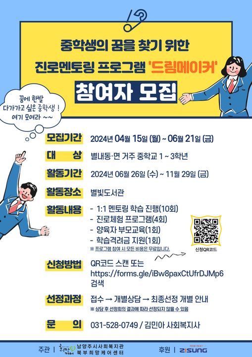 남양주시사회복지관 북부희망케어센터(센터장 전정수)는 '지성ECS' 후원으로 별내동·면 지역 내 진로에 대해 고민하고 있는 중학생을 대상으로 꿈을 찾기 위한 진로멘토링 프로그램 '드림메이커' 참여자를 모집하고 있습니다 !