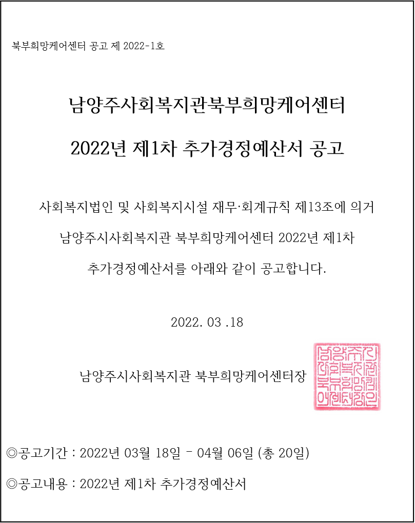 「사회복지법인 및 사회복지시설 재무·회계규칙」제13조에 의거 남양주시 북부희망케어센터 2022년 제1차 추가경정예산서를 아래와 같이 공고합니다. ※게시기간 : 2022. 3. 18. ~ 2021. 4. 06.(20일간)