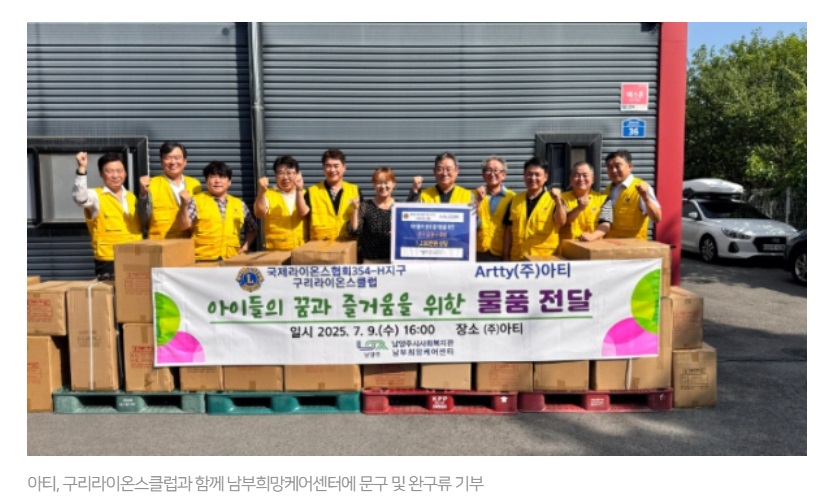 이번 기부는 ㈜아티의 물품 후원과 구리라이온스클럽의 전달 협력을 통해 이뤄졌으며,