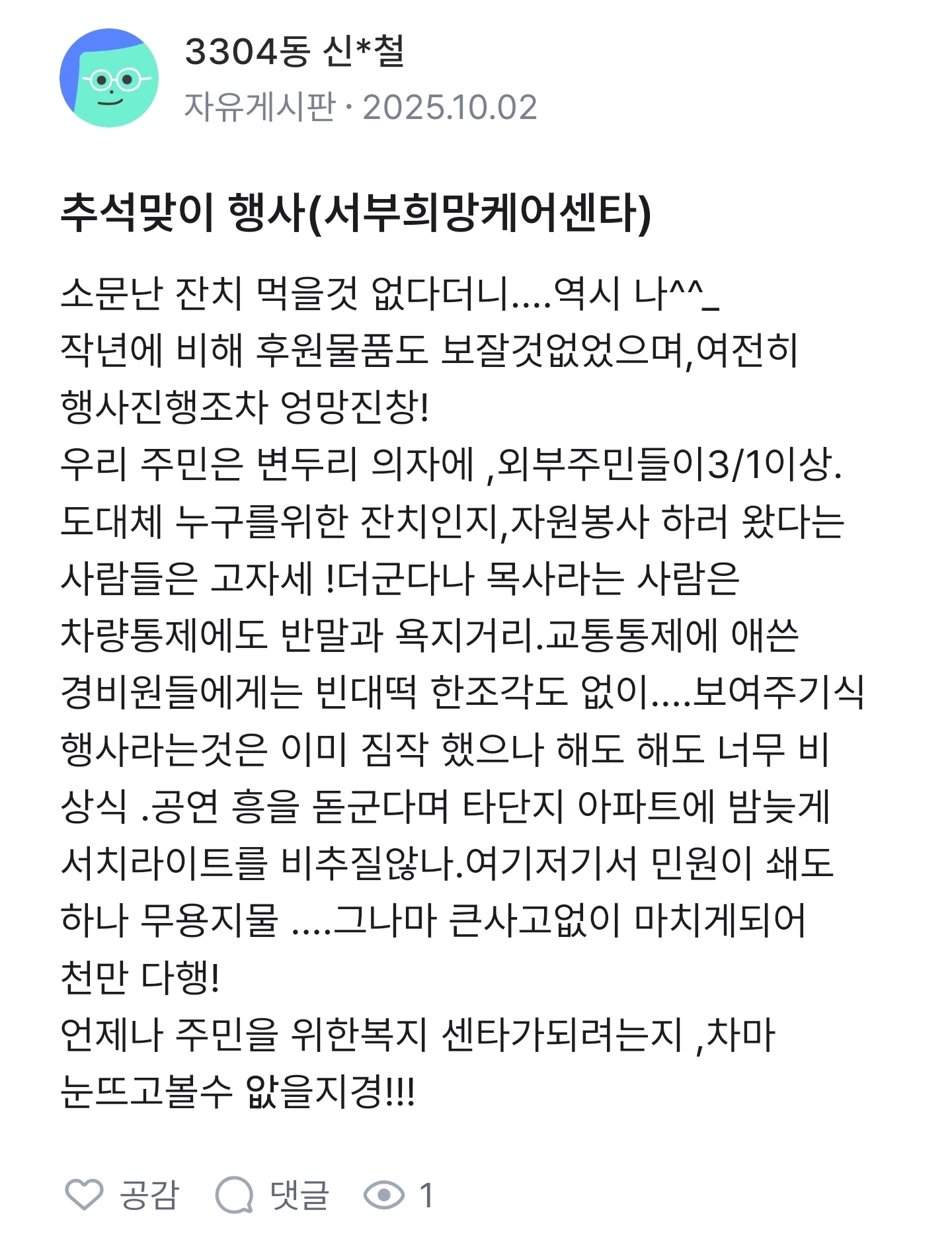 아파트 홈페이지에 지속적으로 올라오는 서부희망케어센터 관련 글들입니다.